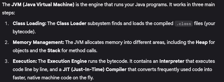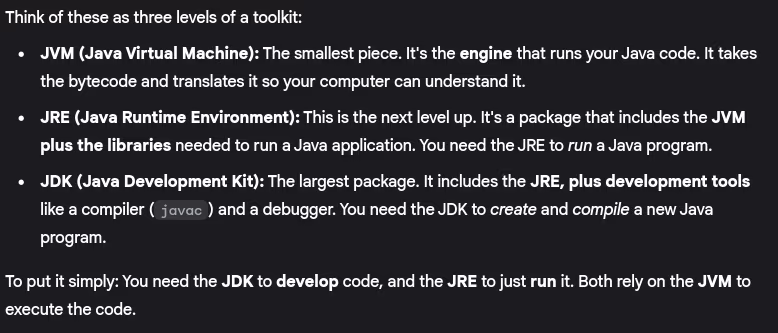 - Explain JDK, JRE, and JVM. What are their differences?