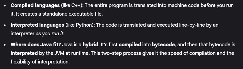 - Difference between compiled and interpreted languages. Where does Java fit?