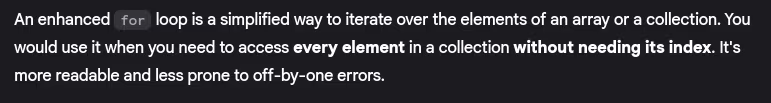 - What is an enhanced for loop (for-each)? When would you use it?
