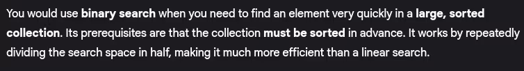 - When would you use binary search? What are its prerequisites?