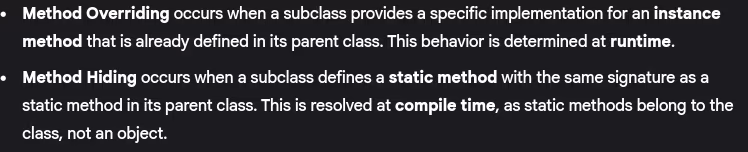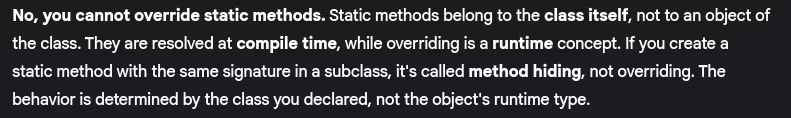 - Can you override static methods? Why or why not?